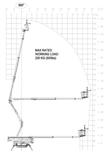 Arbeitshöhe 25.60 m Plattformhöhe 23.60 m Plattformgröße 0,60 x 0,78 x 1,1 m Bühnentragkraft 230 kg Drehbereich 360° Korb schwenkbar 89° Seitliche Reichweite 13,75 m Abstützbreite längsseits 5,40 x 2,50 m / breitseits 4,01 x 3,98 m Durchfahrthöhe 1,99 m Fahrzeugbreite 1,49 m Fahrzeuglänge 6,35 m Eigengewicht 4365 kg Antrieb Diesel Sonstiges volle Proportionalsteuerung, unterstützte automatische Stabilisierung, Steigfähigkeit max. vorn 22° / hinten 26° Führerscheinklasse kein Führerschein erforderlich -